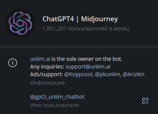 - Найди бота. В поиске Telegram вбей что-то вроде «ChatGPT» или «@gpt3_unlim_chatbot». Один из популярных — @gpt3_unlim_chatbot, но есть и другие.