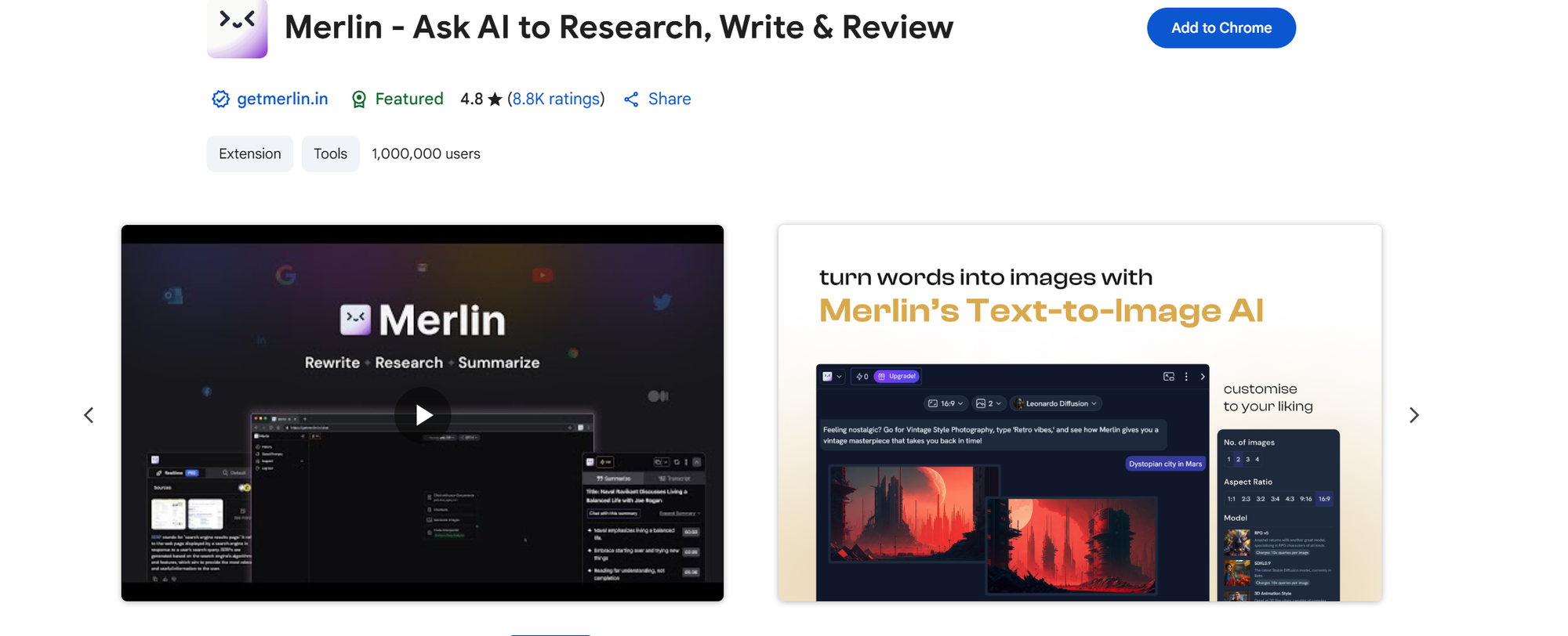 - Найди «Merlin» и нажми «Добавить в Chrome» (или Edge).