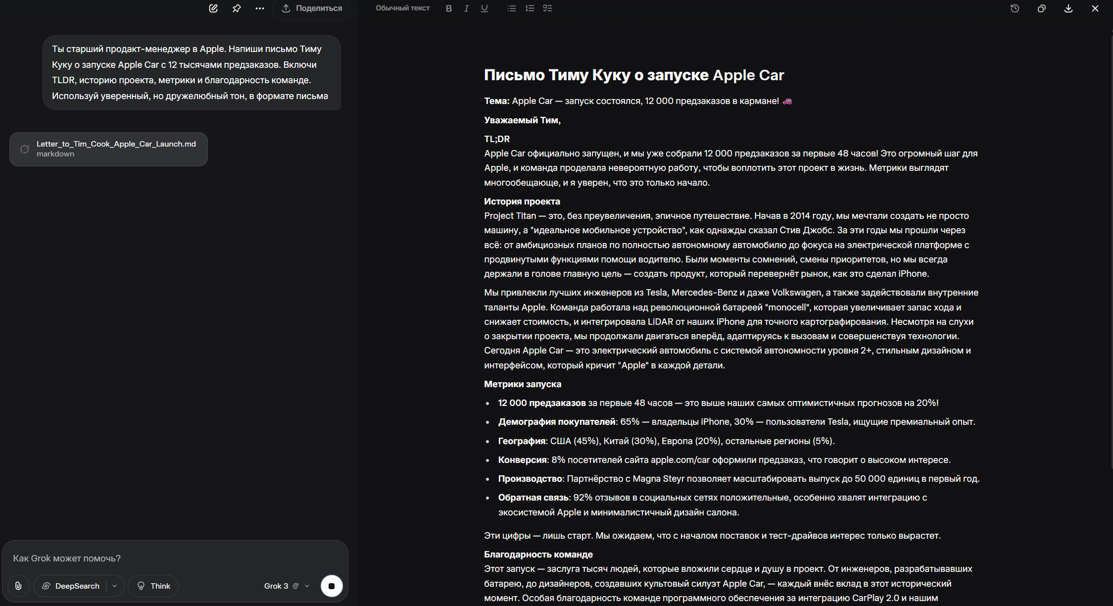 - Пример: «Ты старший продакт-менеджер в Apple. Напиши письмо Тиму Куку о запуске Apple Car с 12 тысячами предзаказов. Включи TLDR, историю проекта, метрики и благодарность команде. Используй уверенный, но дружелюбный тон, в формате письма».