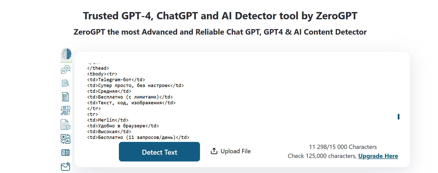 Популярные варианты — GPTZero, ZeroGPT, Contentatscale, Winston AI и Copyleaks. Каждый имеет свои плюсы: ZeroGPT хорош для многоязычных текстов, а Copyleaks — для проверки кода.