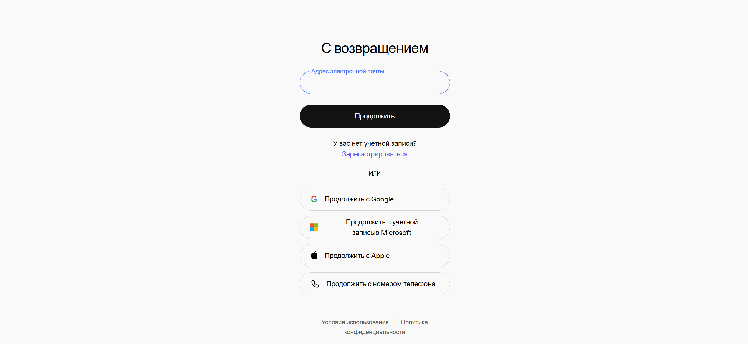 - Без регистрации: После смены IP можно зайти на сайт и использовать ограниченную версию ChatGPT без истории чатов и голосового режима.
